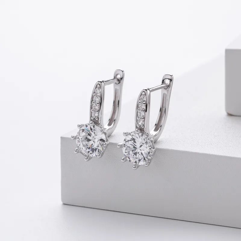 Showcasing a set of chunky huggie hoop earrings available in gold and silver tones. Each pair features either a dazzling single solitaire or a star-shaped drop for two distinct looks. Their secure, hinged closure and sparkling stones make them a comfortable and glamorous daily choice.