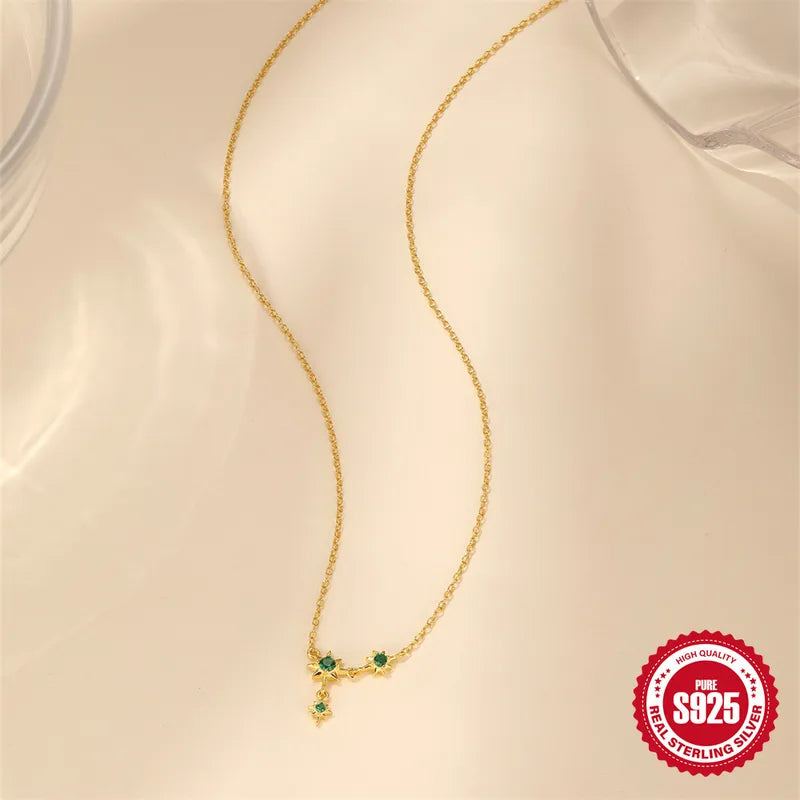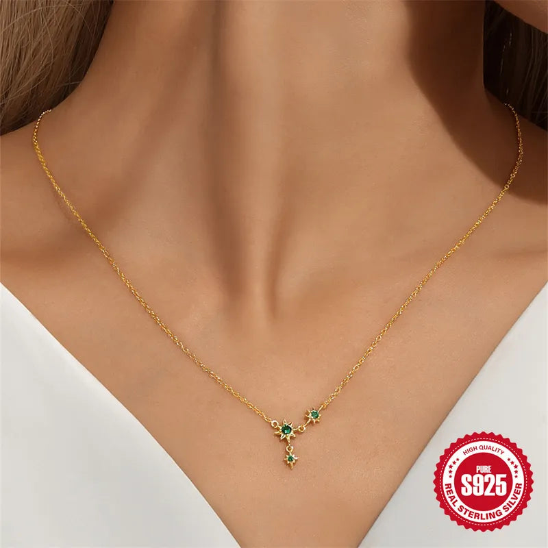 Stunning gold-plated sterling silver necklace featuring a delicate, celestial design. Showcasing an asymmetrical cluster of sparkling, emerald-green star pendants, evoking the beauty of a miniature constellation.